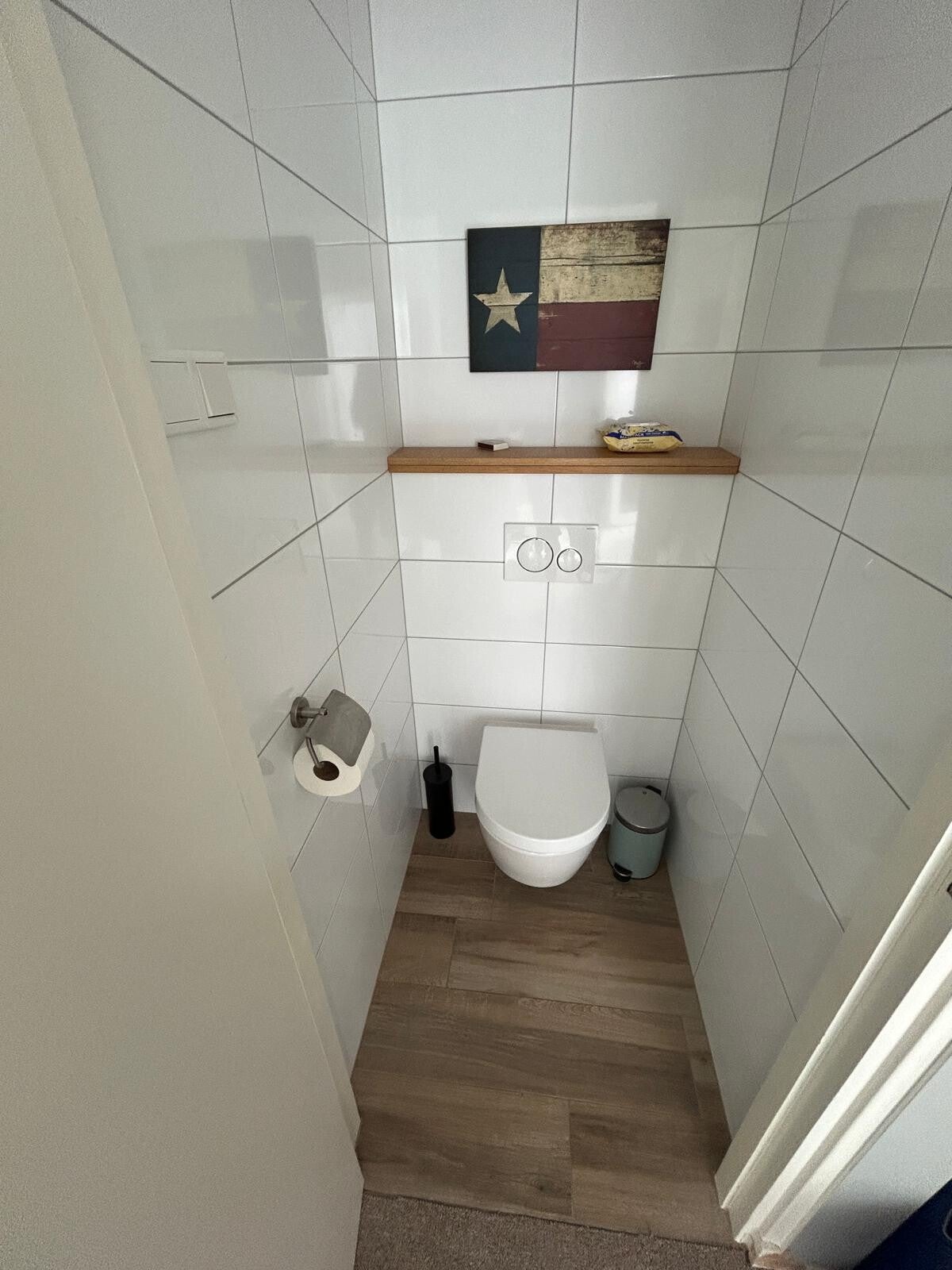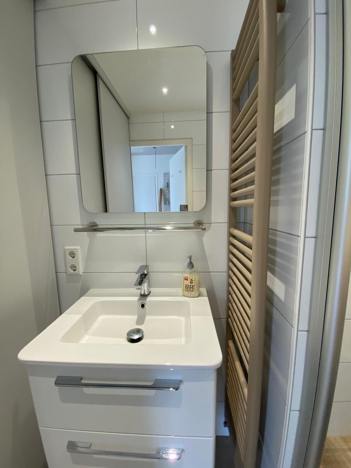 Das Badezimmer ist mit einer Dusche und einem Waschbecken ausgestattet. Die Toilette ist separat. Zusätzlich finden Sie im Badezimmer eine Waschmaschine und einen Wäschetrockner.